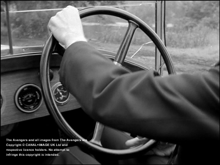 the first time in The Hour That Never Was, where Steed has an accident as he avoids a collision with a dog.