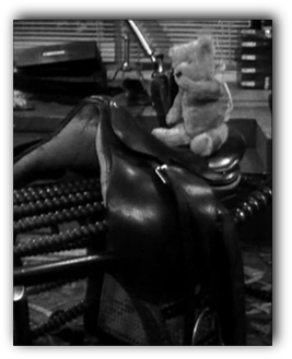 Steed's teddy in his saddle in Dressed to Kill. The saddle can be seen here, in series 4 The Girl from Auntie in the taxi and in series 5 in the storage room of the flat in episode Who's Who???